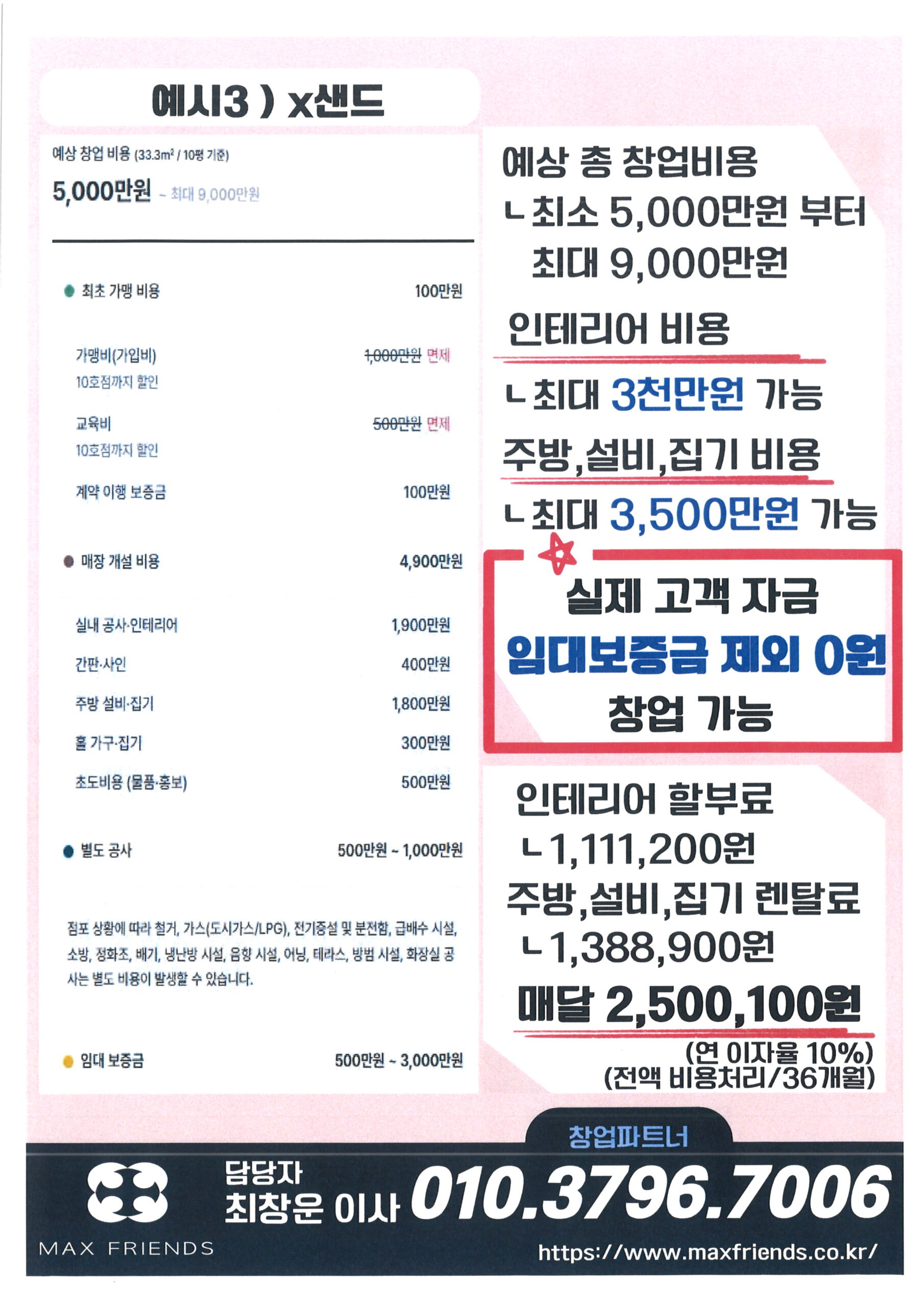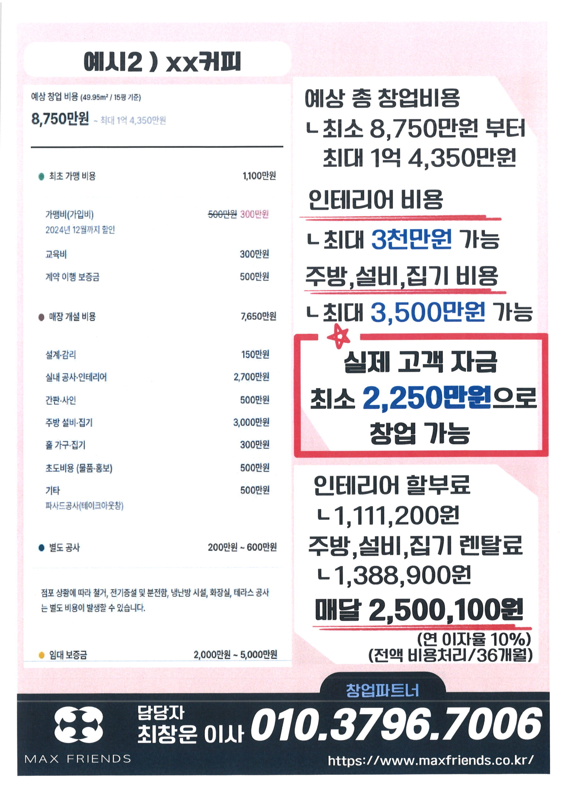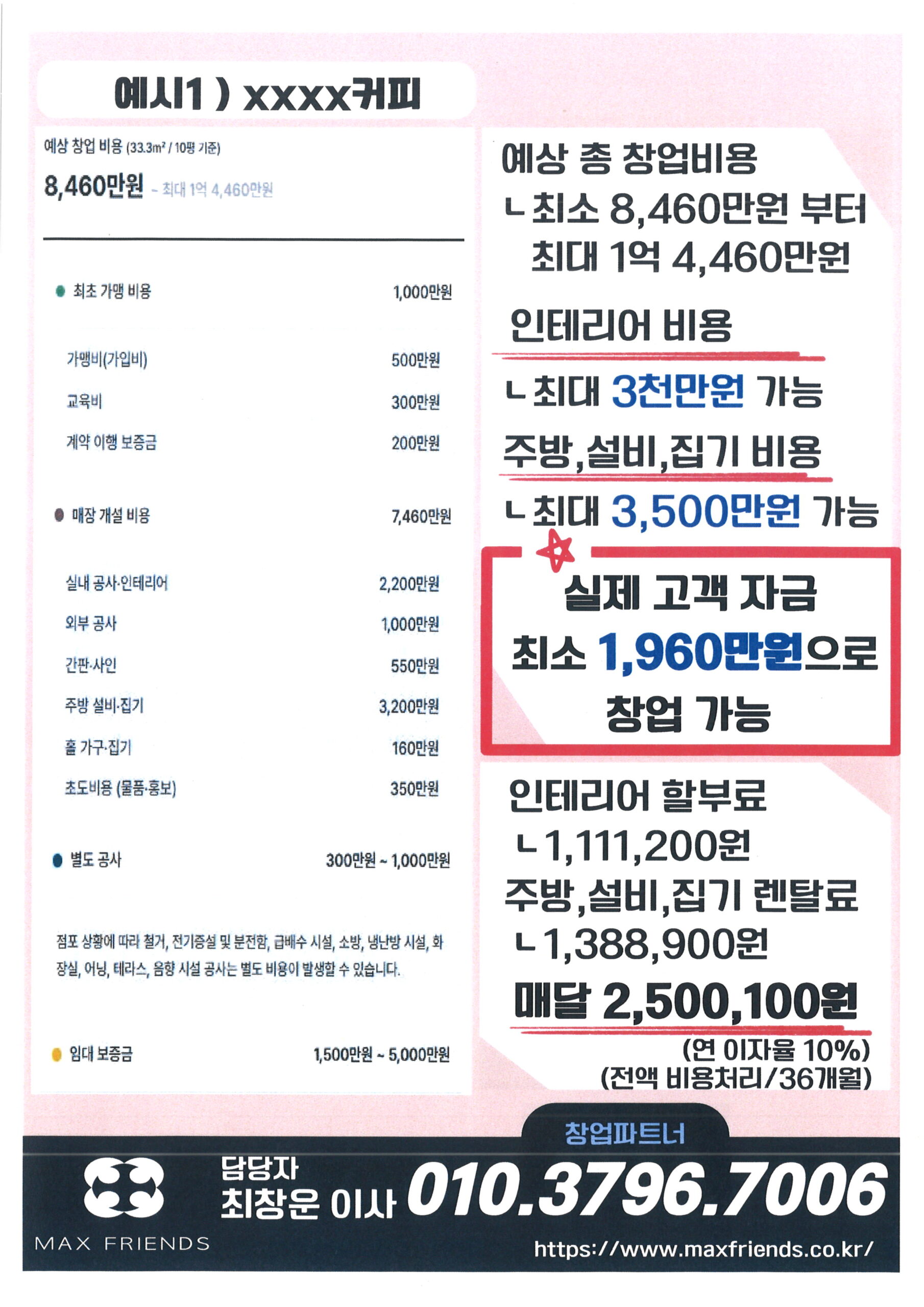 창업 상담 방문예약 맥스프렌즈에 방문하셔서 상담 받아보세요 더 알아보기 상담신청서 고민하고 계시다면, 무료 상담을 신청하세요. 상담신청하기 “새로운 도전, 안정적인 지원! 창업 성공의 파트너가 되어 드리겠습니다.” 맥스프렌즈와 함께하세요 온라인 상담신청서 창업, 무료상담 신청하세요 이 양식을 작성하려면 브라우저에서 JavaScript를 활성화하십시오.이 양식을 작성하려면 브라우저에서 JavaScript를 활성화하십시오.이름 *연락처 *상호명 *업종 *사업장 주소 *영업담당자 전화번호 **인테리어 할부 진행인테리어 공사 전후사진 필수 첨부*설비, 집기 렌탈 진행장비 명판(모델명,제조사,시리얼넘버) 사진, 설치 사진 필수 첨부Email상담하기